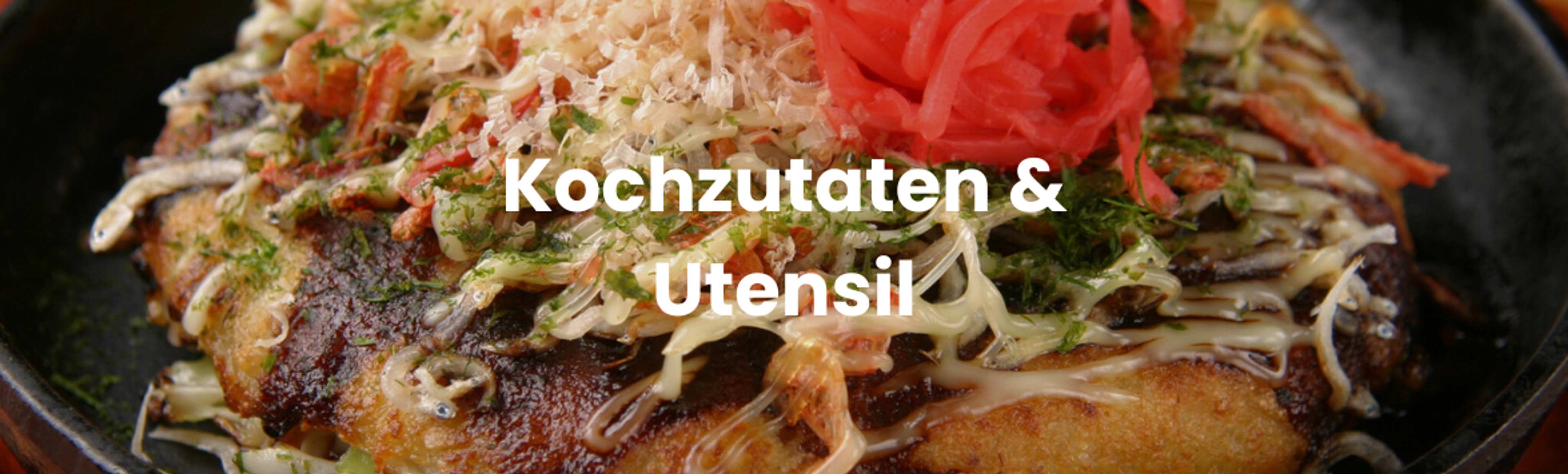 • 360 g Okonomiyaki-Teigmischung • 40 g Katsuobushi (Bonitoflocken) • 1 Flasche Okonomiyaki-Sauce • 5 g Aonori (Seetang-Pulver) • 1 Glas eingelegter Sushi-Ingwer • 400 g Weißkohl (ein halber Kopf) • 5 Stangen Frühlingszwiebeln • Japanische Mayonnaise • 1 Ei (optional)