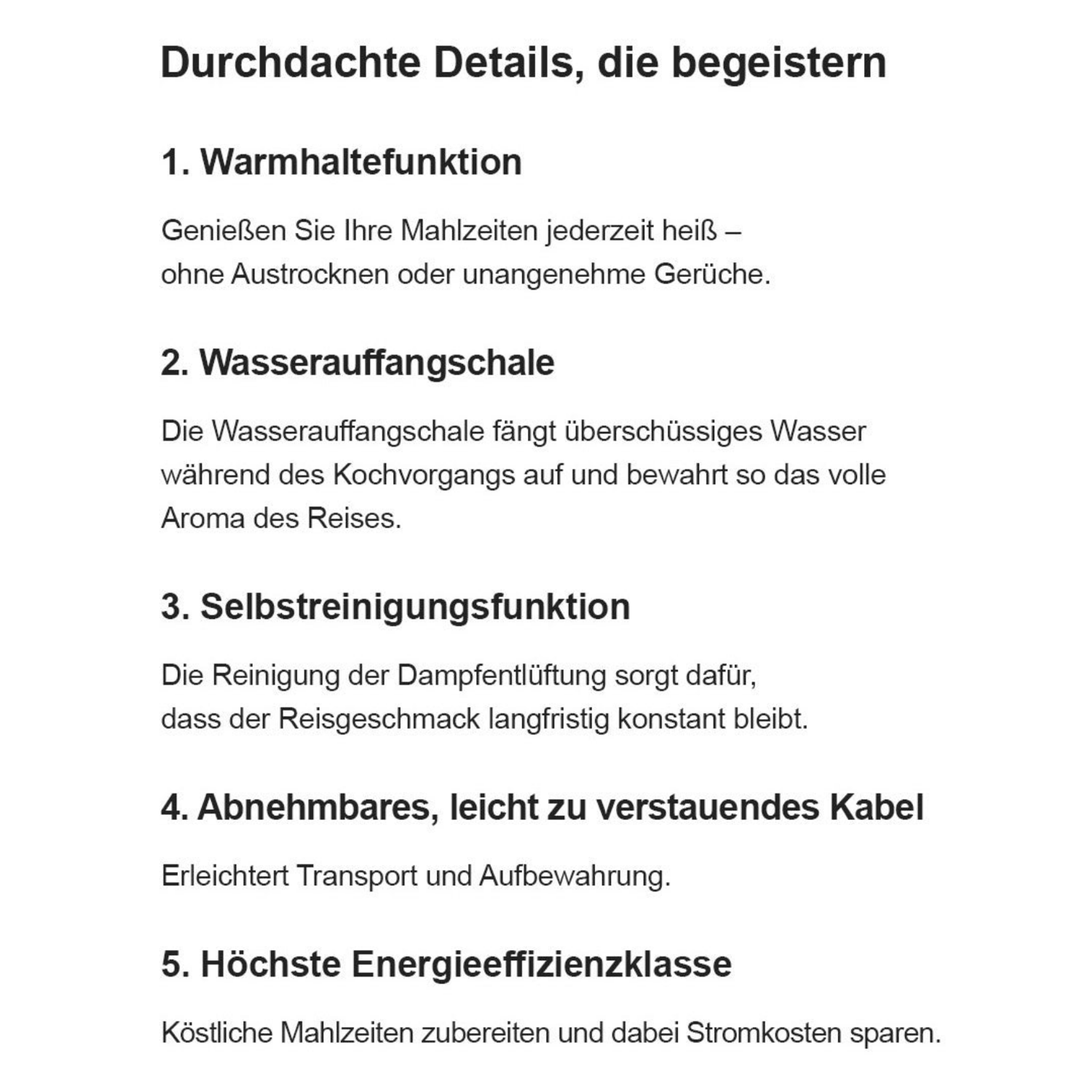 | Leistung | 880 W (kochend) / 95 W (warm) |