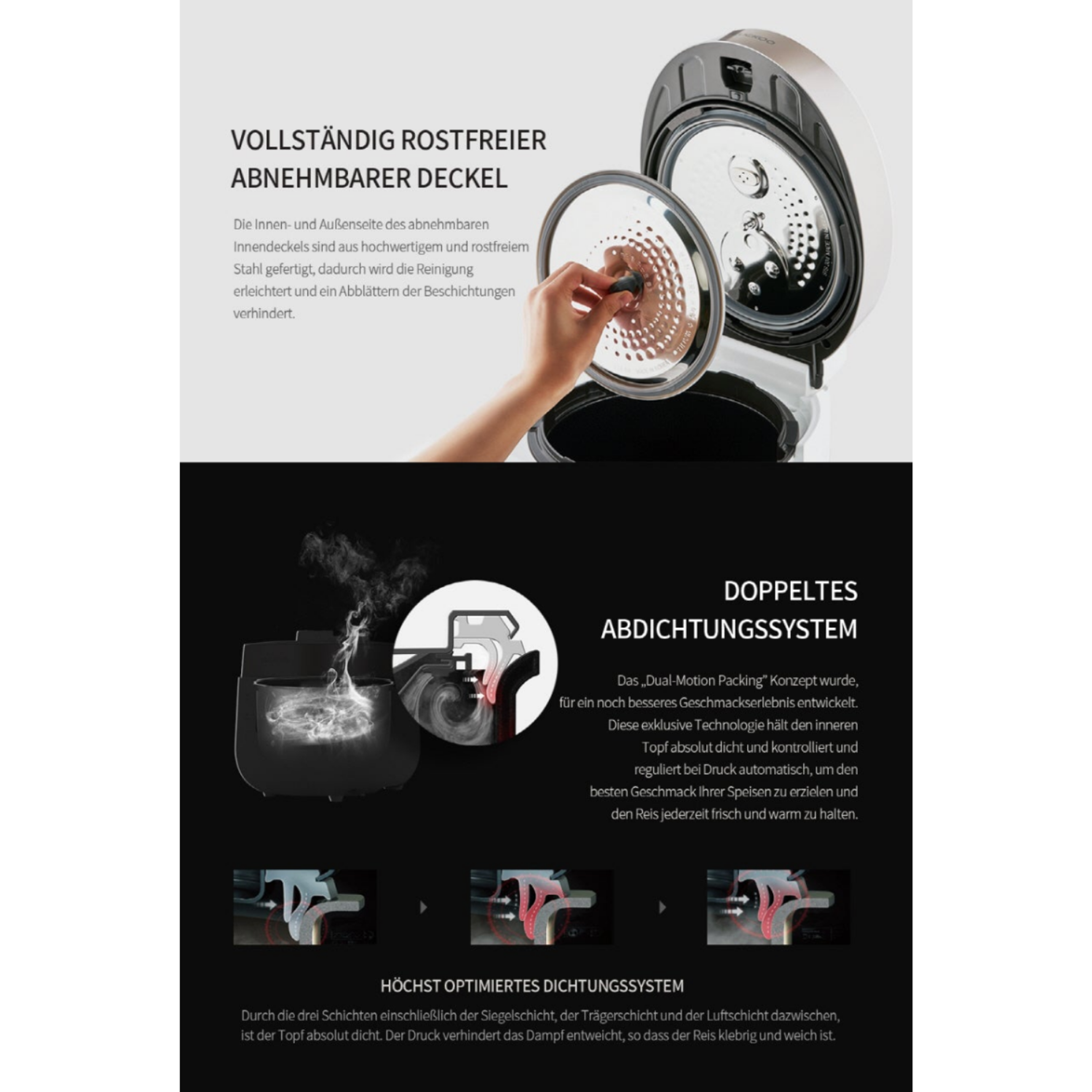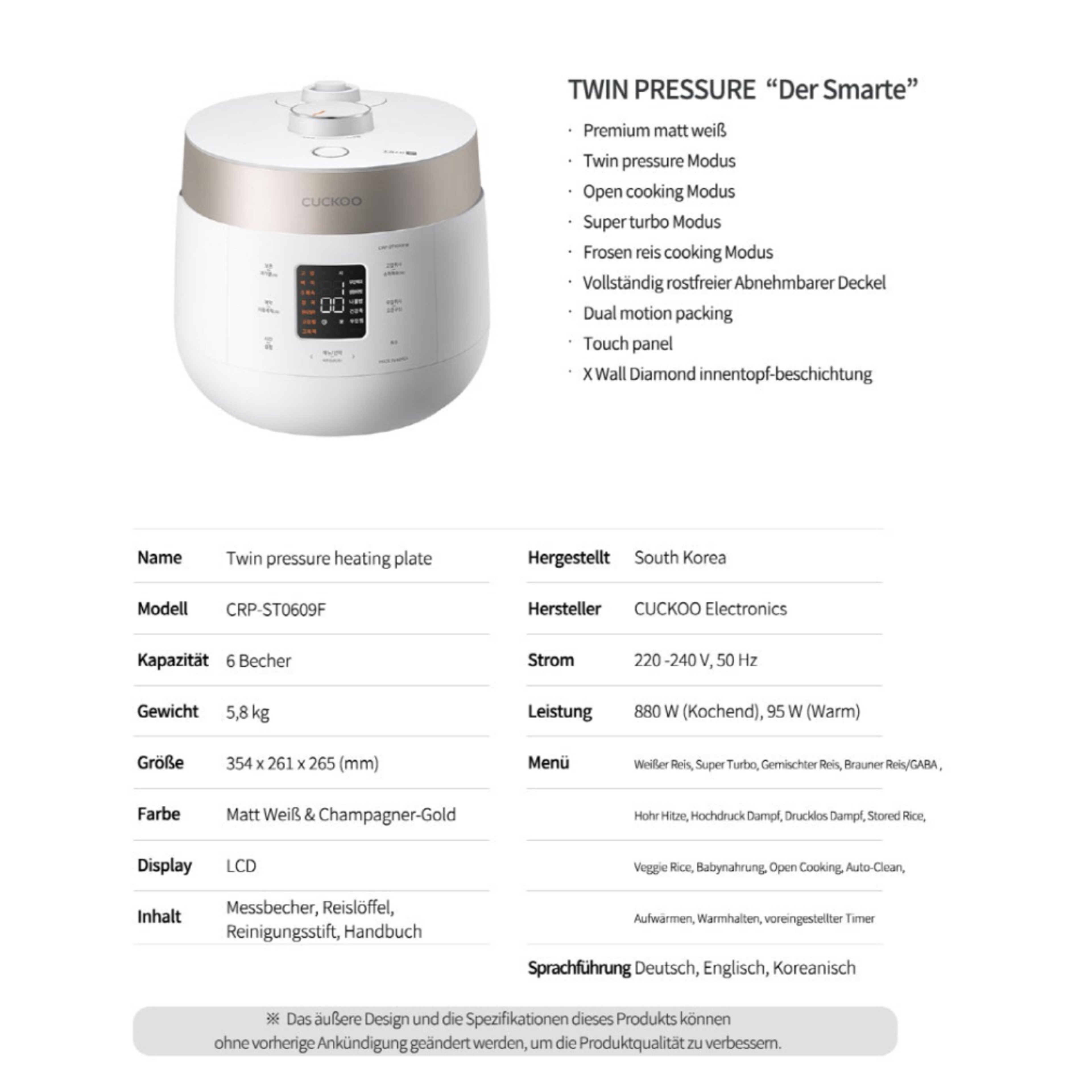 Gefertigt in Südkorea, dem Ursprung moderner Reiskocher-Technologie, steht der CUCKOO CRP-ST0609F für Langlebigkeit, Sicherheit und kompromisslose Qualität. Mit seinem soliden Gewicht von 5,8 kg vermittelt er Stabilität und Wertigkeit – weit entfernt von kurzlebiger Massenware.
