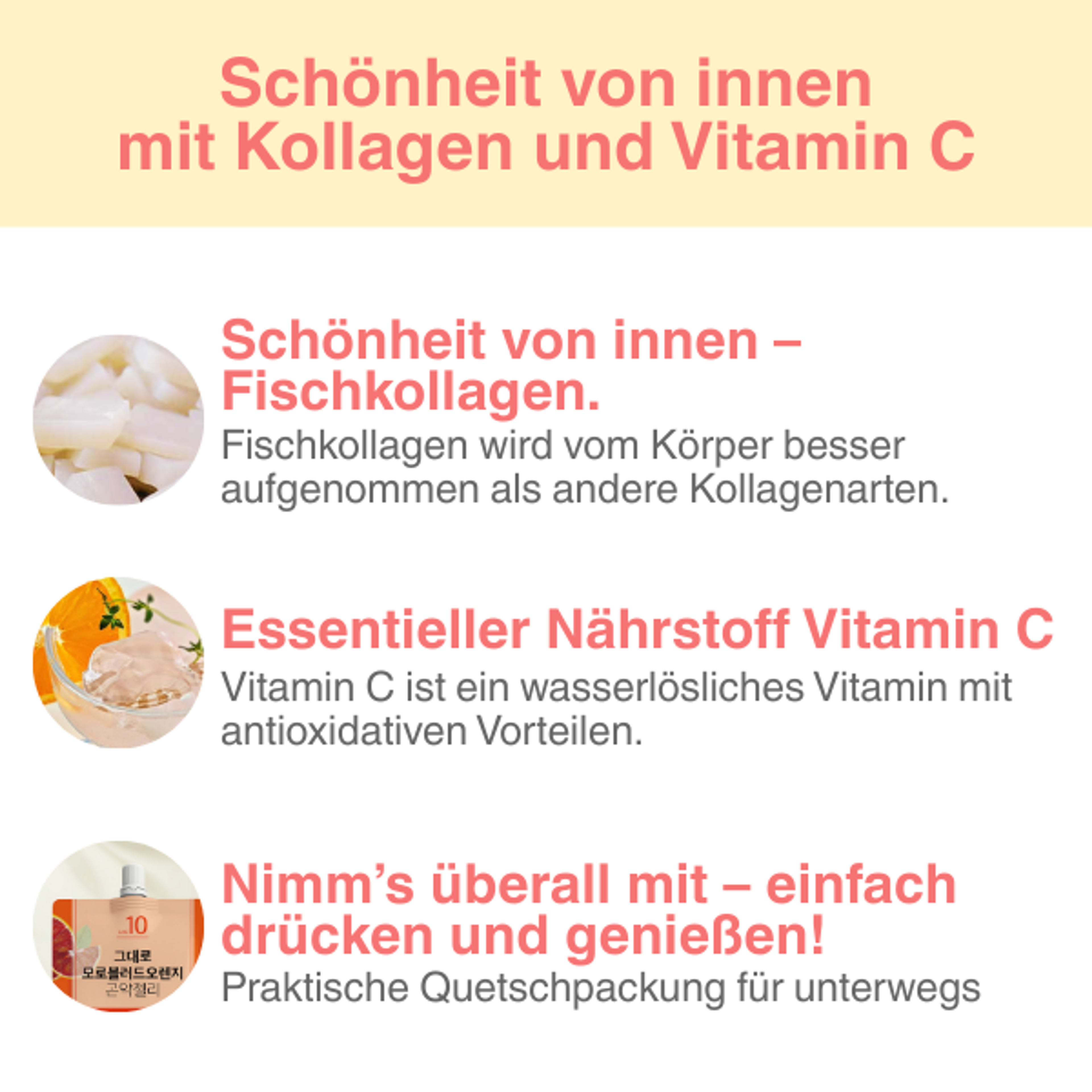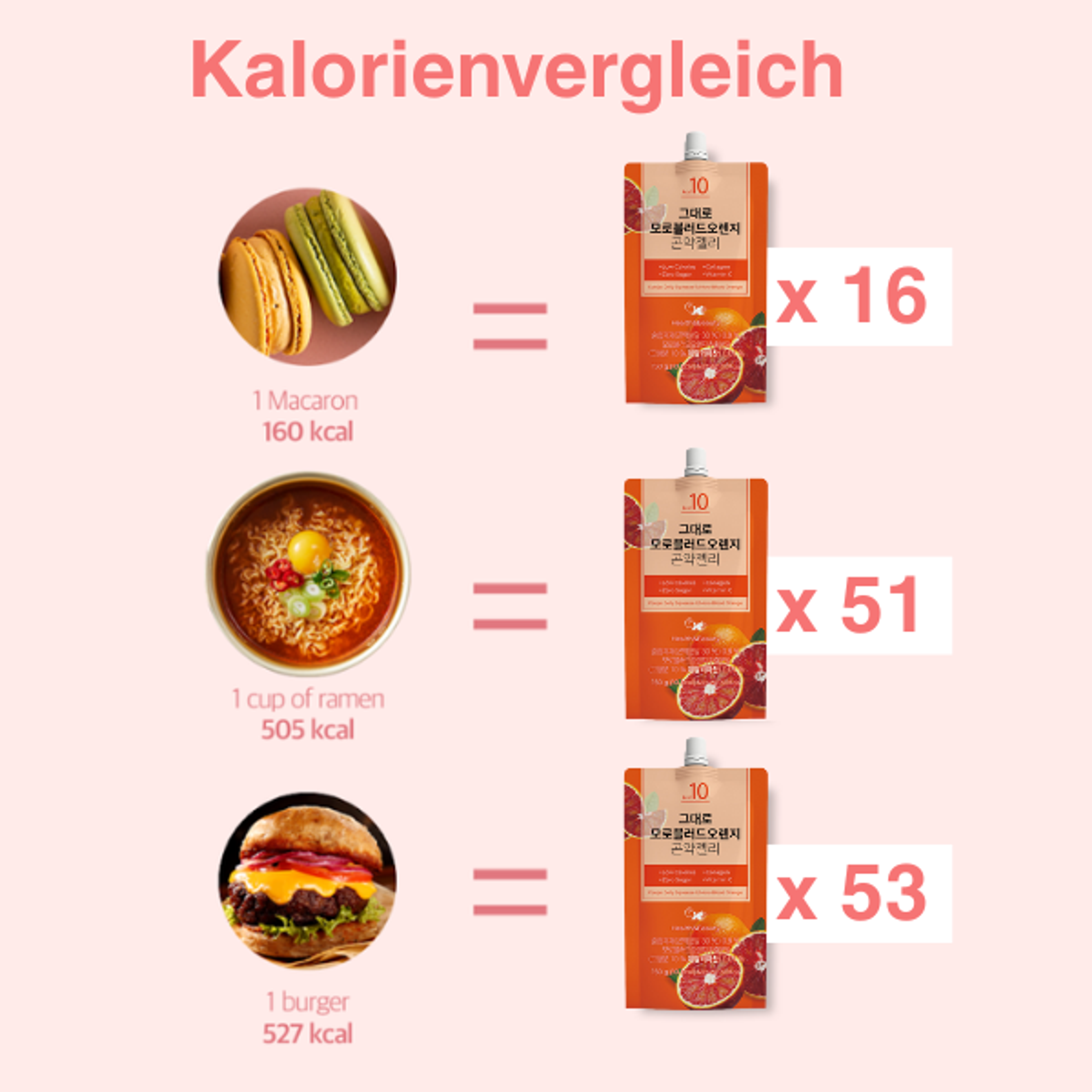 Wasser, Erythrit, Geliermittelmischung (Konjakpulver, Carrageen, Trinatriumcitrat, Kaliumchlorid, Dextrin, Calciumlactat, Gellangummi, Johannisbrotkernmehl, Xanthan), Pulver aus konzentriertem Moro-Blutorangensaft, Zitronensäure, Calciumlactat, Sucralose, enzymatisch modifiziertes Stevia, künstliches Aroma (Moro-Blutorange), Lebensmittelfarbstoff Rot Nr. 40 (Allurarot), Fischkollagenpeptid, Vitamin C. Enthält: FISCH.