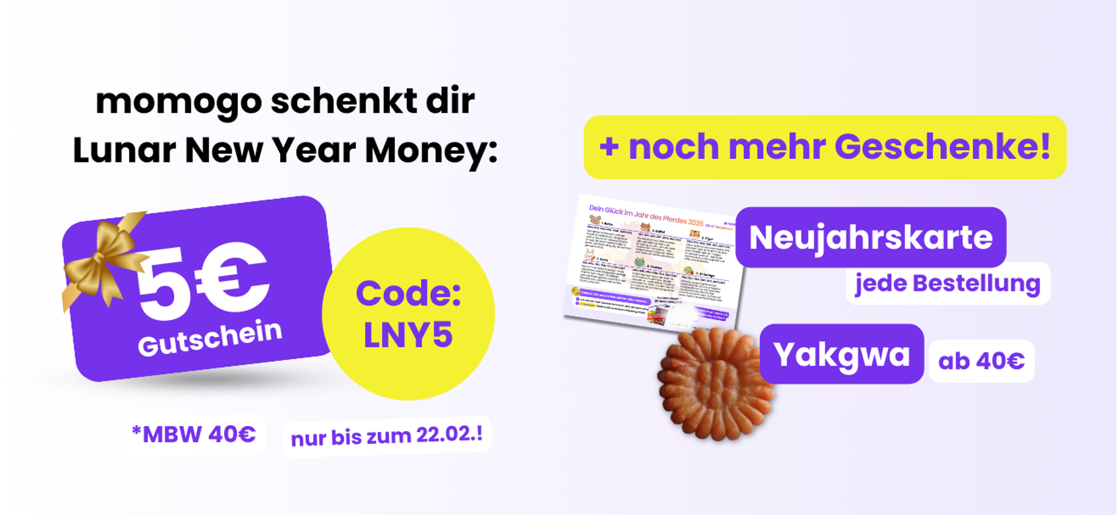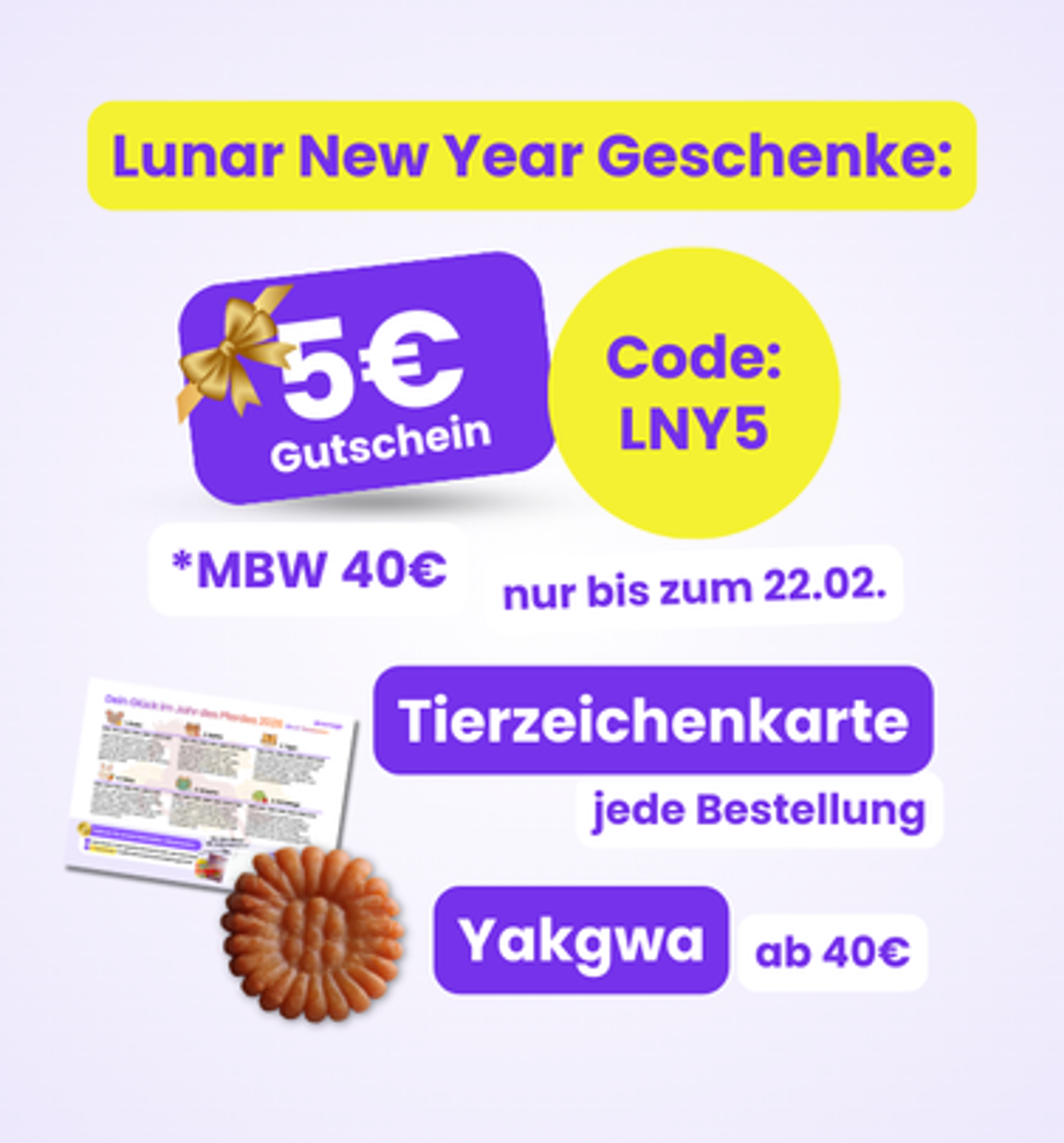 Zum Lunar New Year warten besondere Extras auf dich: 5 € Gutschein, eine Neujahrskarte & koreanische Snacks – nur für kurze Zeit. 🥳