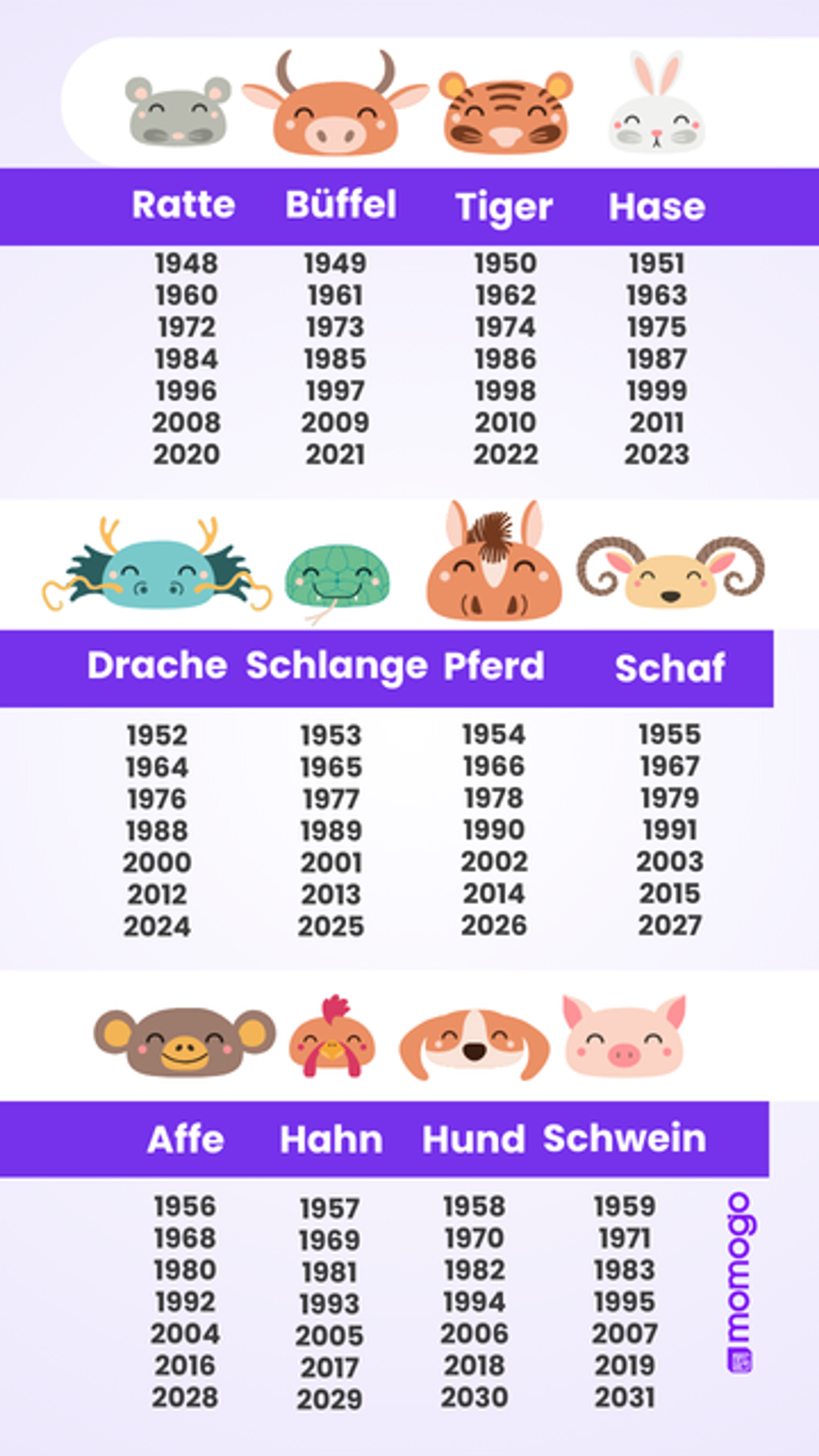 Das Tierzeichen-System umfasst 12 Tiere, die jeweils für ein Jahr stehen. Finde dein eigenes Tierzeichen in der Abbildung und teile es mit Familie und Freunden. Ein spielerischer Blick auf typische Eigenschaften und kleine Glücksmomente für das Jahr.